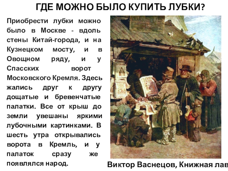 Слайд 23Приобрести лубки можно было в Москве - вдоль стены Китай-города,