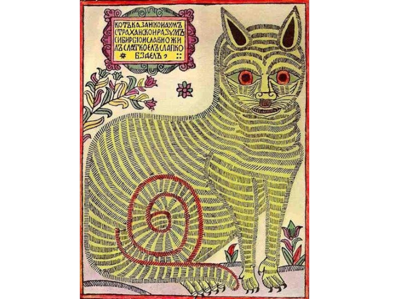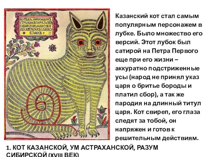 лубок был сатирой на Петра Первого еще при его жизни – аккуратно подстриженные усы (народ не принял указ царя о бритье бороды и платил сбор), а так же пародия на длинный титул царя. Кот свиреп, его глаза следят за тобой, он напряжен и готов к решительным действиям.