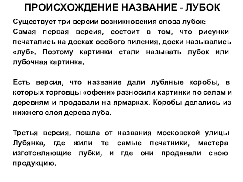 Слайд 26Существует три версии возникновения слова лубок: