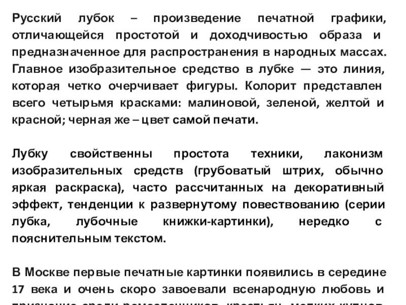 Слайд 20Русский лубок – произведение печатной графики, отличающейся простотой и доходчивостью