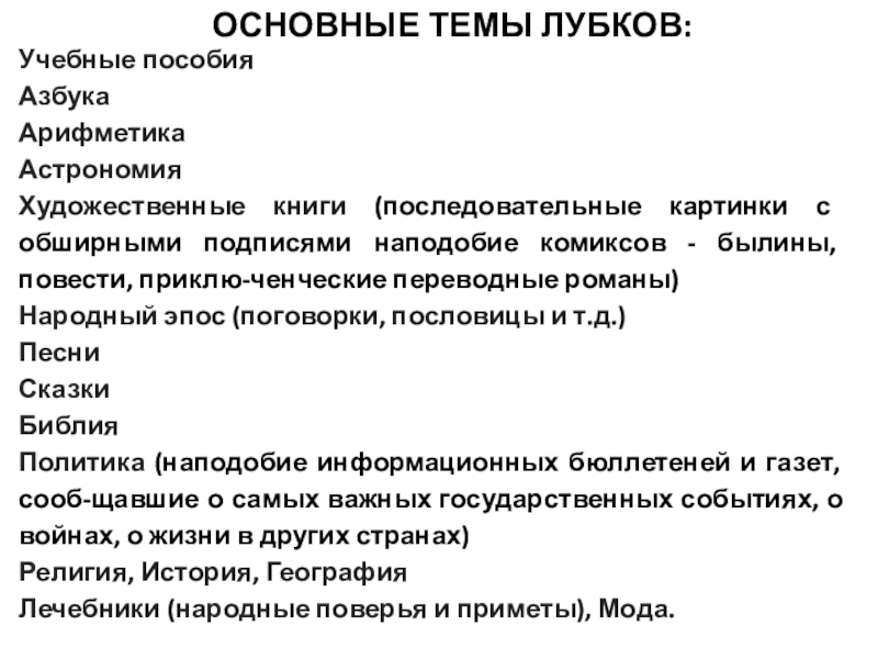 ОСНОВНЫЕ ТЕМЫ ЛУБКОВ: