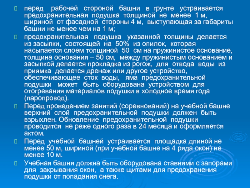 Перед проведением занятий (соревнований) на учебной башне верхний слой предохранительной подушки должен быть взрыхлен. Обновление предохранительной подушки проводится не реже одного раза в 24 месяца и оформляется актом.