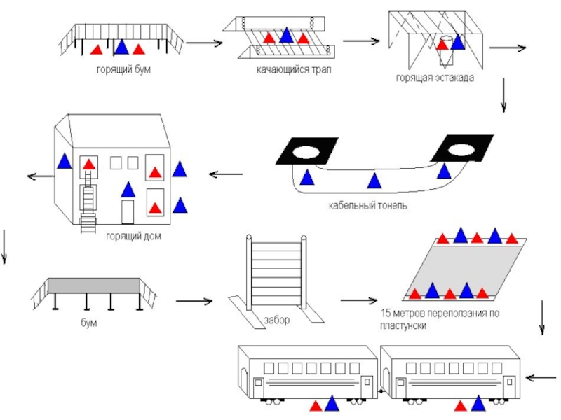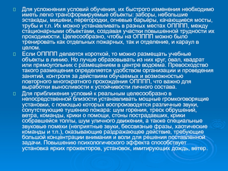мосты, трубы и т.п. Их можно устанавливать в разных местах ОПППП, между стационарными объектами, создавая участки повышенной трудности их проходимости. Целесообразно, чтобы на ОПППП можно было тренировать как отдельных пожарных, так и отделение, и караул в целом.