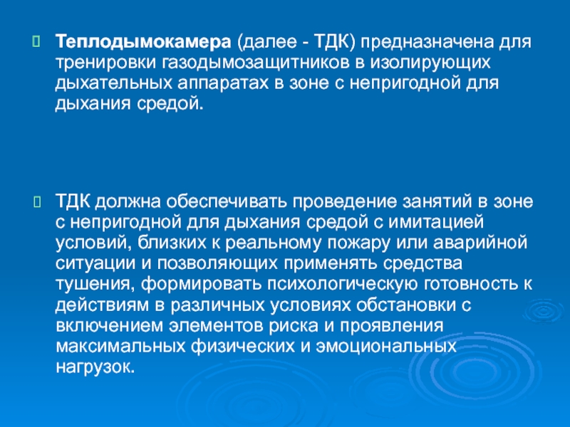 Слайд 5Теплодымокамера (далее - ТДК) предназначена для тренировки газодымозащитников в изолирующих