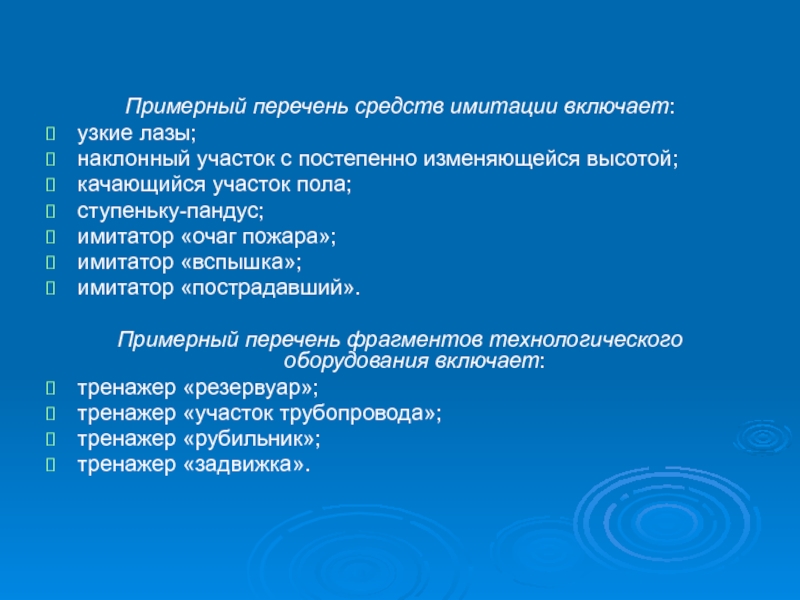 При использовании средств имитации (очагов пожаров, последствий взрывов, обрушений и других опасных факторов, повреждений приборов и трубопроводов и др.), необходимо применять меры, исключающие возможность возникновения аварийных ситуаций, повреждений и несчастных случаев.