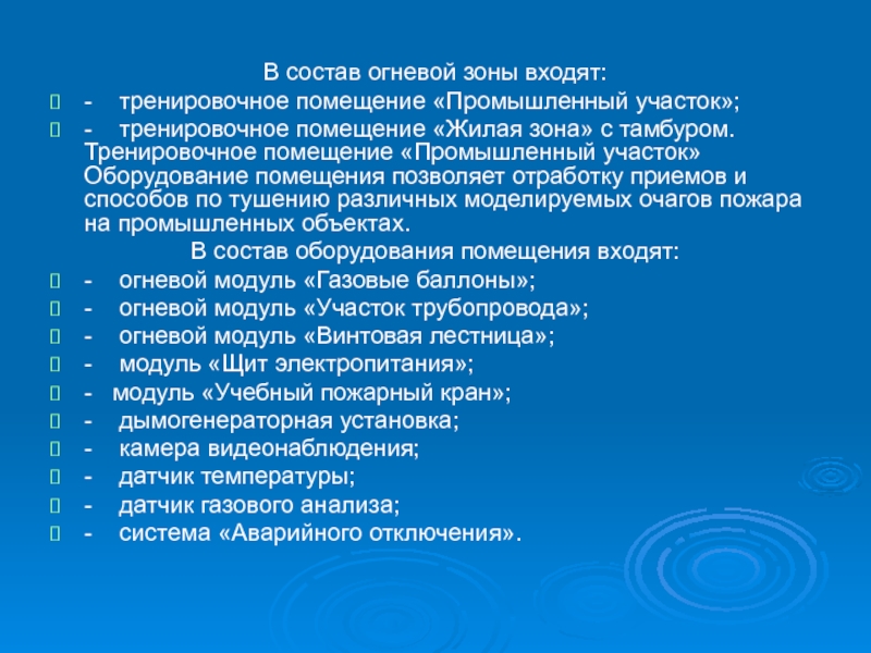 участок» Оборудование помещения позволяет отработку приемов и способов по тушению различных моделируемых очагов пожара на промышленных объектах.