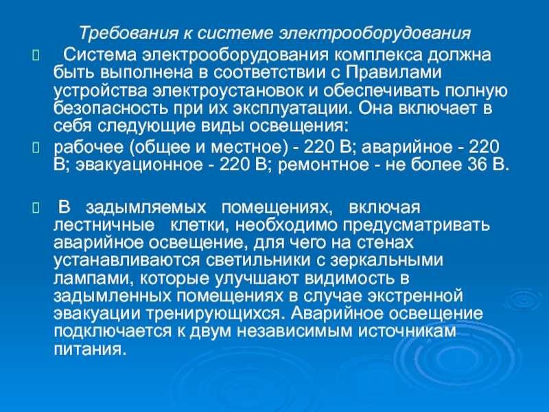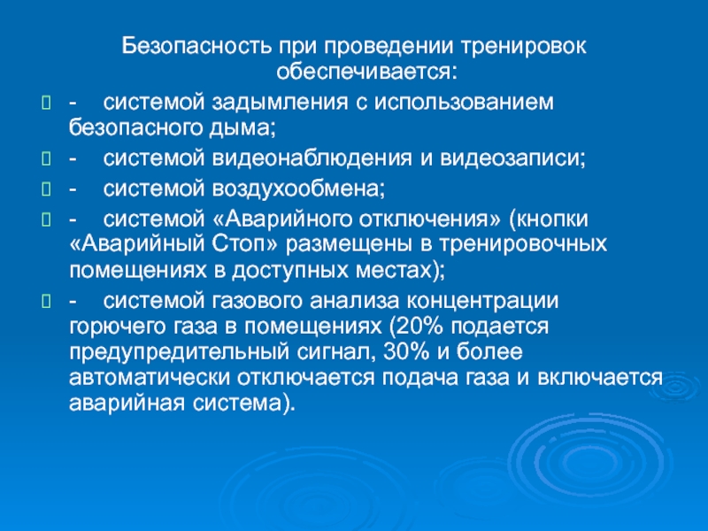 системой «Аварийного отключения» (кнопки «Аварийный Стоп» размещены в тренировочных помещениях в доступных местах);