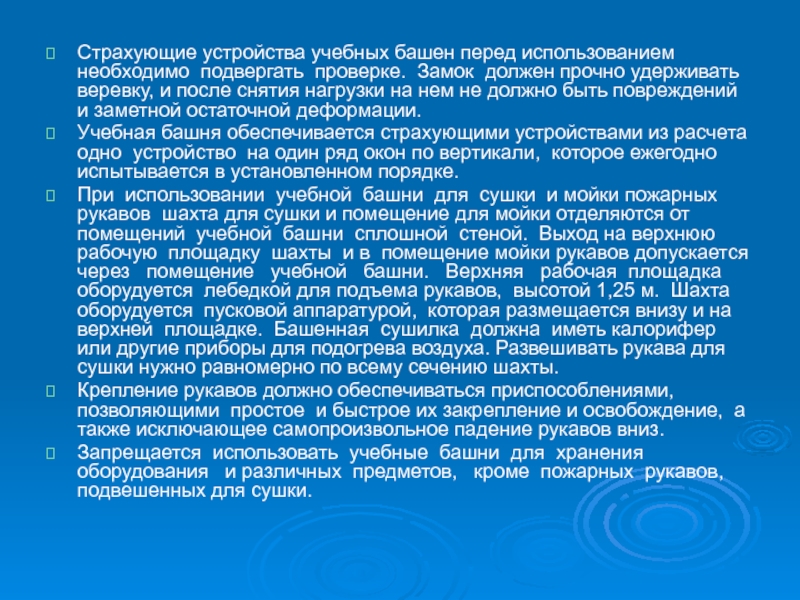 Учебная башня обеспечивается страхующими устройствами из расчета одно устройство на один ряд окон по вертикали, которое ежегодно испытывается в установленном порядке.