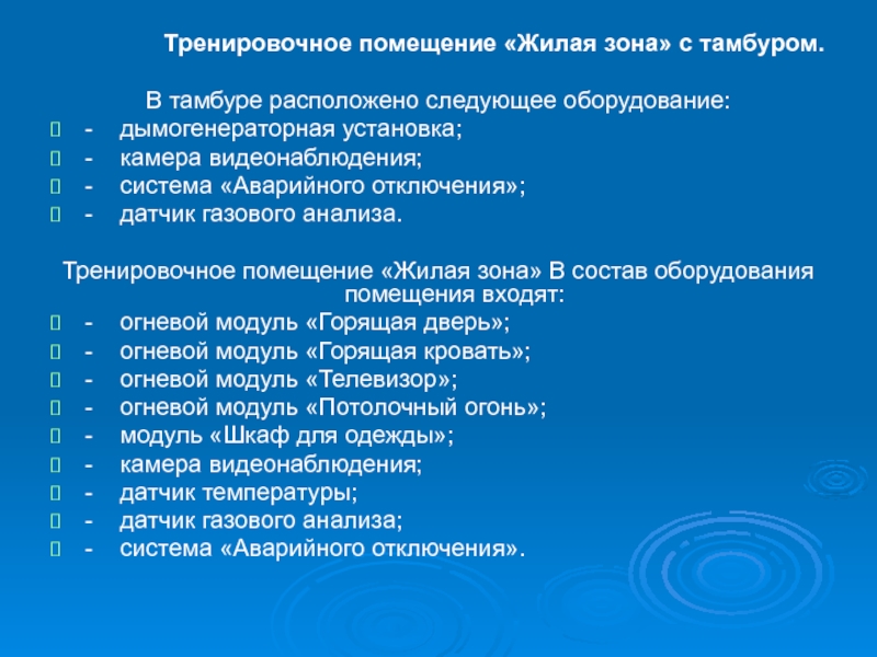 Тренировочное помещение «Жилая зона» В состав оборудования помещения входят: