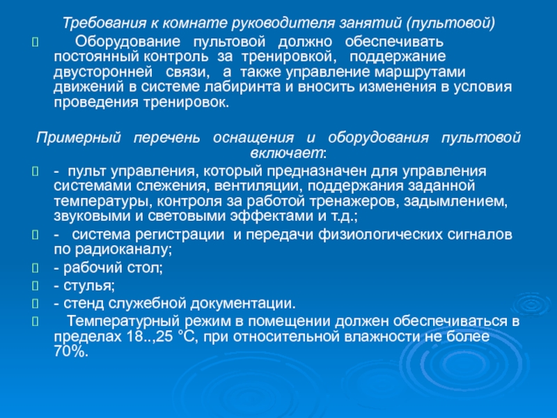 - пультовая (помещение руководителя занятий).