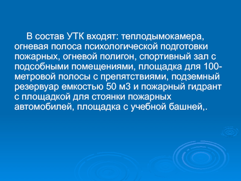 Слайд 4 В состав УТК входят: теплодымокамера, огневая полоса психологической подготовки пожарных,