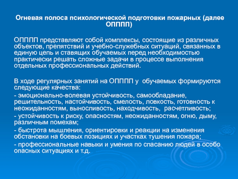 Слайд 10Огневая полоса психологической подготовки пожарных (далее ОПППП)