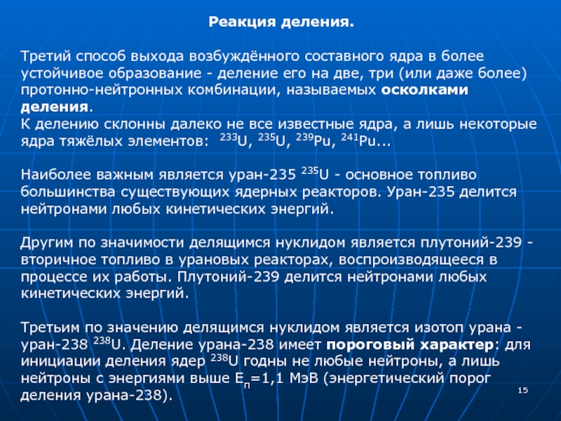 Наиболее важным является уран-235 235U - основное топливо большинства существующих ядерных реакторов. Уран-235 делится нейтронами любых кинетических энергий.