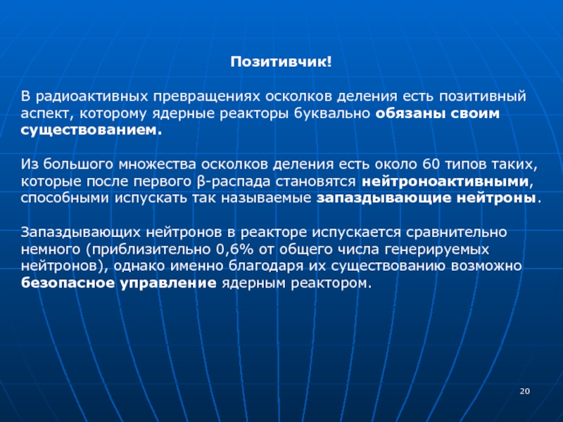 Запаздывающих нейтронов в реакторе испускается сравнительно немного (приблизительно 0,6% от общего числа генерируемых нейтронов), однако именно благодаря их существованию возможно безопасное управление ядерным реактором.