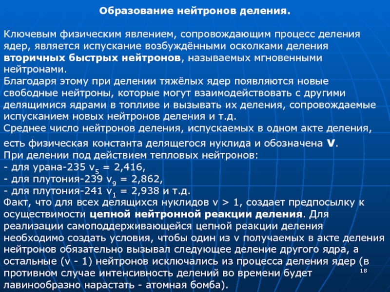 Факт, что для всех делящихся нуклидов > 1, создает предпосылку к осуществимости цепной нейтронной реакции деления. Для реализации самоподдерживающейся цепной реакции деления необходимо создать условия, чтобы один из получаемых в акте деления нейтронов обязательно вызывал следующее деление другого ядра, а остальные ( - 1) нейтронов исключались из процесса деления ядер (в противном случае интенсивность делений во времени будет лавинообразно нарастать - атомная бомба).
