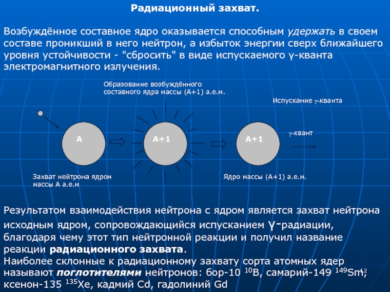 Наиболее склонные к радиационному захвату сорта атомных ядер называют поглотителями нейтронов: бор-10 10B, самарий-149 149Sm, ксенон-135 135Xe, кадмий Cd, гадолиний Gd