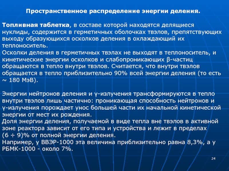 Энергии нейтронов деления и -излучения трансформируются в тепло внутри твэлов лишь частично: проникающая способность нейтронов и -излучения порождает унос большей части их начальной кинетической энергии от мест их рождения.