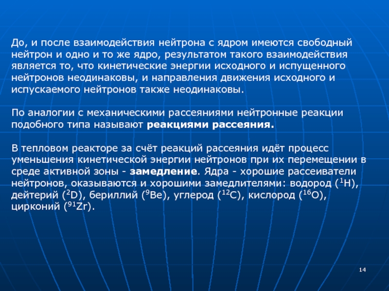 В тепловом реакторе за счёт реакций рассеяния идёт процесс уменьшения кинетической энергии нейтронов при их перемещении в среде активной зоны - замедление. Ядра - хорошие рассеиватели нейтронов, оказываются и хорошими замедлителями: водород (1Н), дейтерий (2D), бериллий (9Be), углерод (12С), кислород (16О), цирконий (91Zr).