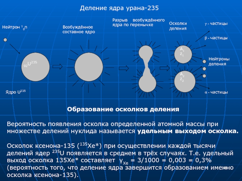 ксенона-135 (135Xe*) при осуществлении каждой тысячи делений ядер 235U появляется в среднем в трёх случаях. Т.е. удельный выход осколка 135Xe* составляет Xe = 3/1000 = 0,003 = 0,3%