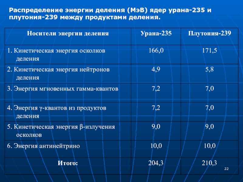 Слайд 22Распределение энергии деления (МэВ) ядер урана-235 и плутония-239 между продуктами