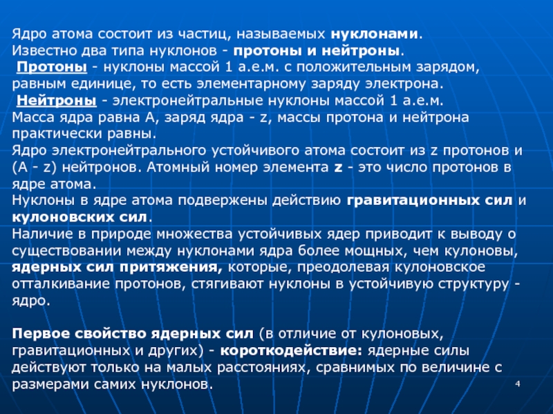 Слайд 4Ядро атома состоит из частиц, называемых нуклонами.