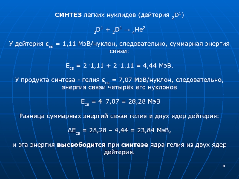 Слайд 8СИНТЕЗ лёгких нуклидов (дейтерия 2D1)