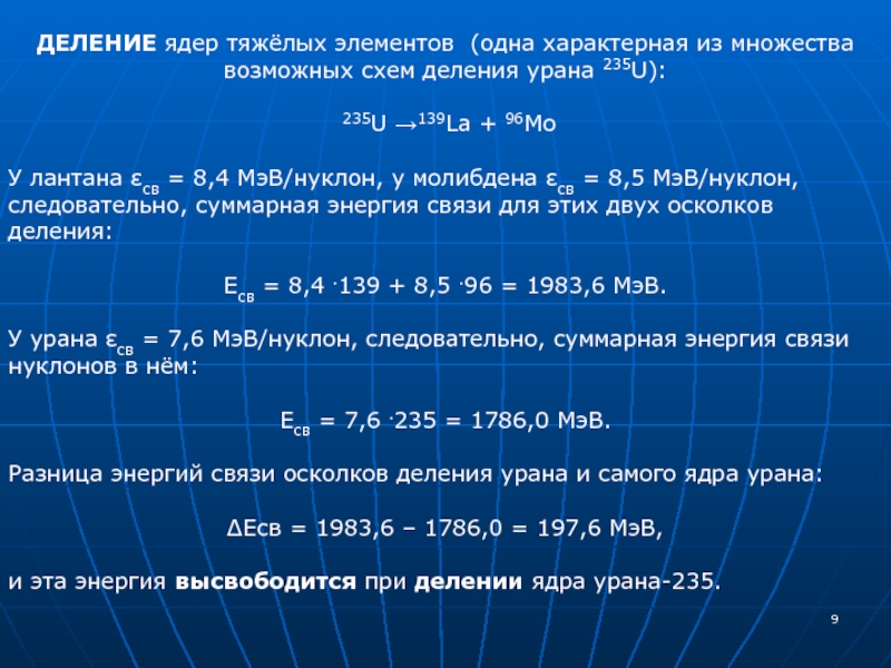 8,4 МэВ/нуклон, у молибдена св = 8,5 МэВ/нуклон, следовательно, суммарная энергия связи для этих двух осколков деления: