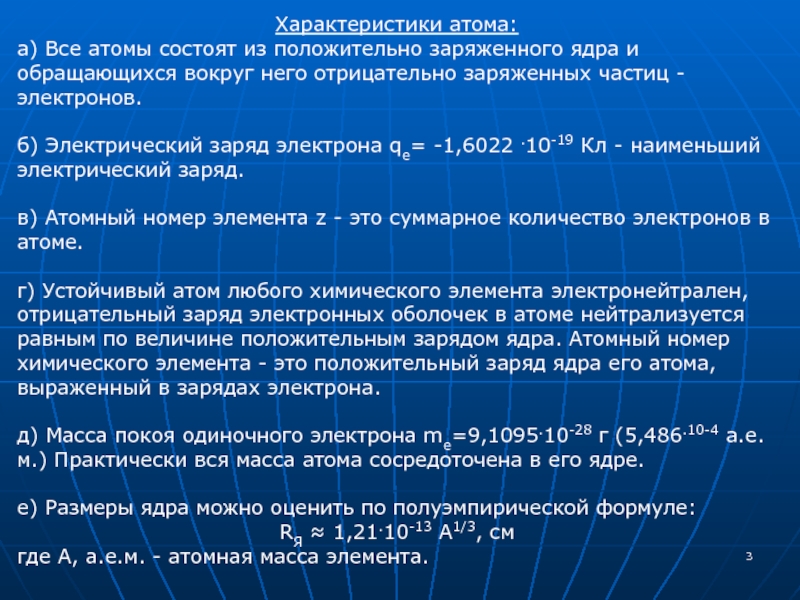 д) Масса покоя одиночного электрона mе=9,1095.10-28 г (5,486.10-4 а.е.м.) Практически вся масса атома сосредоточена в его ядре.
