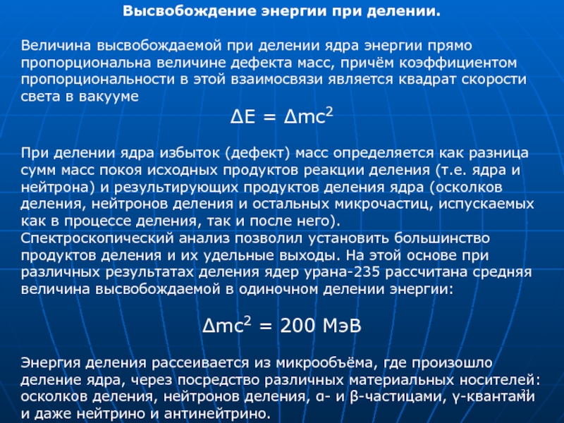 Энергия деления рассеивается из микрообъёма, где произошло деление ядра, через посредство различных материальных носителей: осколков деления, нейтронов деления, - и -частицами, -квантами и даже нейтрино и антинейтрино.