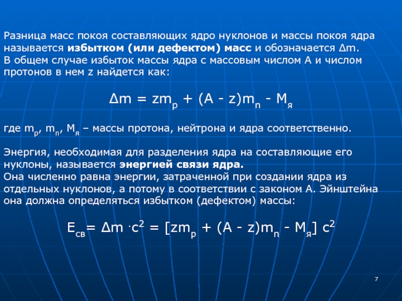 Слайд 7Разница масс покоя составляющих ядро нуклонов и массы покоя ядра