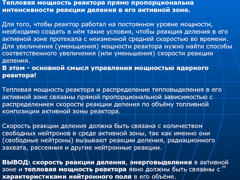 Слайд 25Тепловая мощность реактора прямо пропорциональна интенсивности реакции деления в его