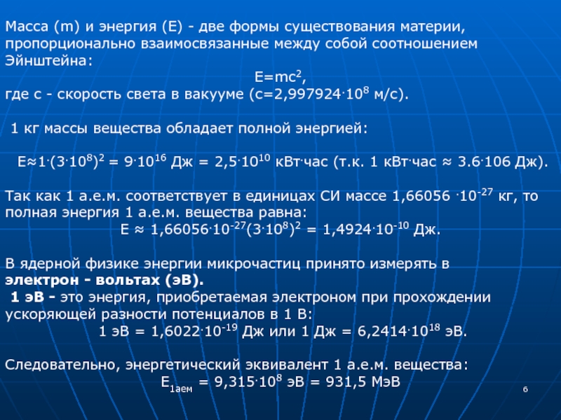 Слайд 6Масса (m) и энергия (Е) - две формы существования материи,