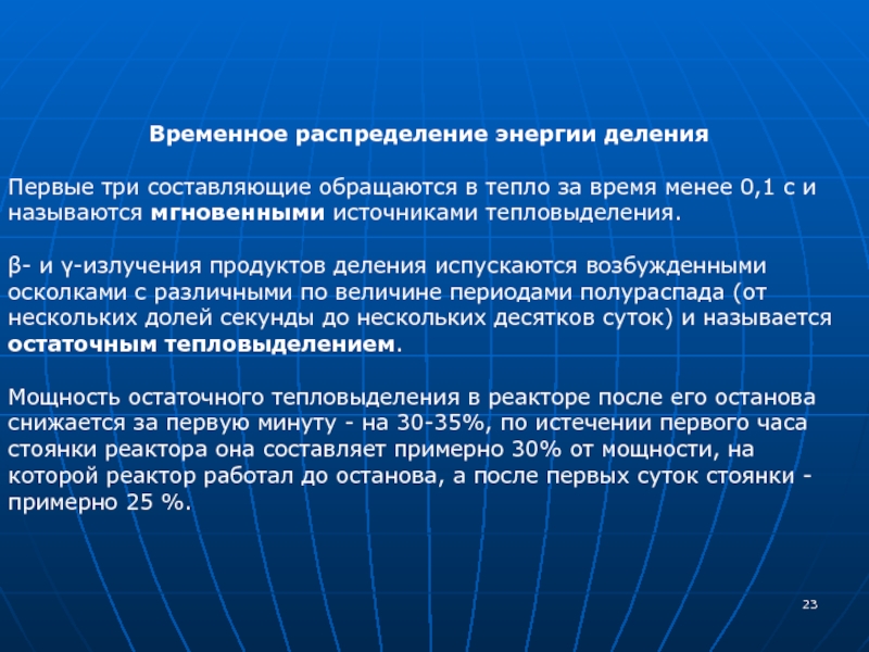 -излучения продуктов деления испускаются возбужденными осколками с различными по величине периодами полураспада (от нескольких долей секунды до нескольких десятков суток) и называется остаточным тепловыделением.