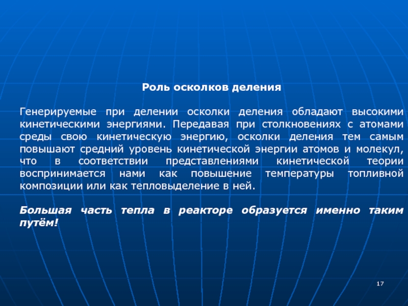осколки деления тем самым повышают средний уровень кинетической энергии атомов и молекул, что в соответствии представлениями кинетической теории воспринимается нами как повышение температуры топливной композиции или как тепловыделение в ней.