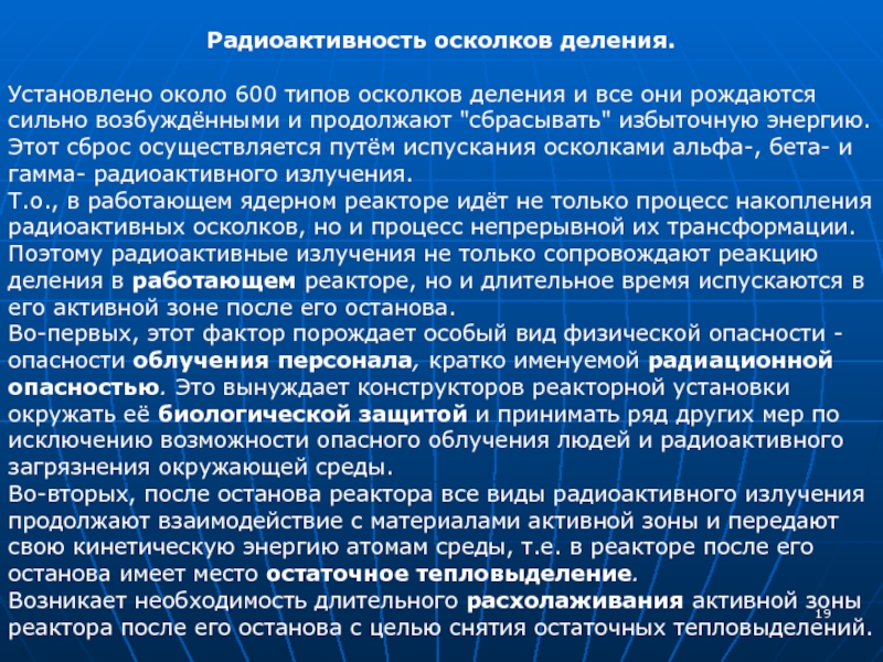 Поэтому радиоактивные излучения не только сопровождают реакцию деления в работающем реакторе, но и длительное время испускаются в его активной зоне после его останова.