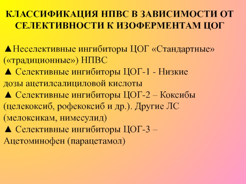 Селективные ингибиторы ЦОГ-2 – Коксибы (целекоксиб, рофекоксиб и др.). Другие ЛС (мелоксикам, нимесулид)
