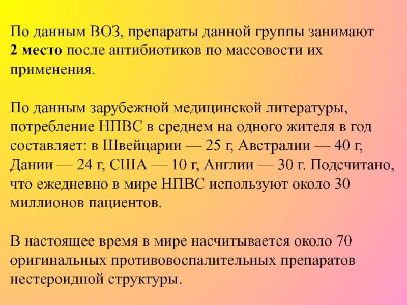 потребление НПВС в среднем на одного жителя в год составляет: в Швейцарии — 25 г, Австралии — 40 г, Дании — 24 г, США — 10 г, Англии — 30 г. Подсчитано, что ежедневно в мире НПВС используют около 30 миллионов пациентов.