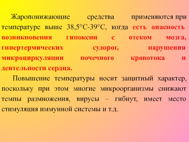 Повышение температуры носит защитный характер, поскольку при этом многие микроорганизмы снижают темпы размножения, вирусы – гибнут, имеет место стимуляция иммунной системы и т.д.
