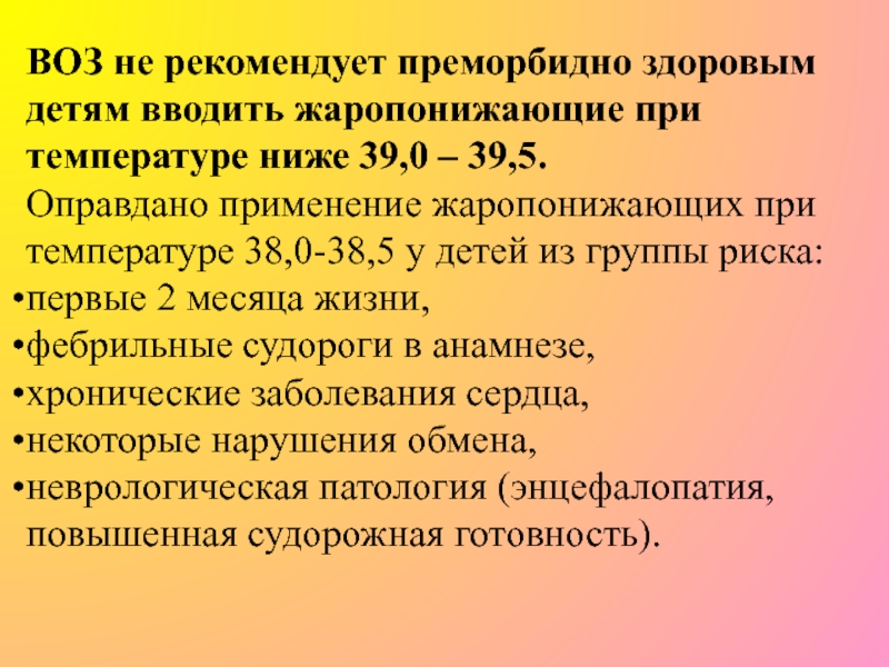 Слайд 25ВОЗ не рекомендует преморбидно здоровым детям вводить жаропонижающие при температуре