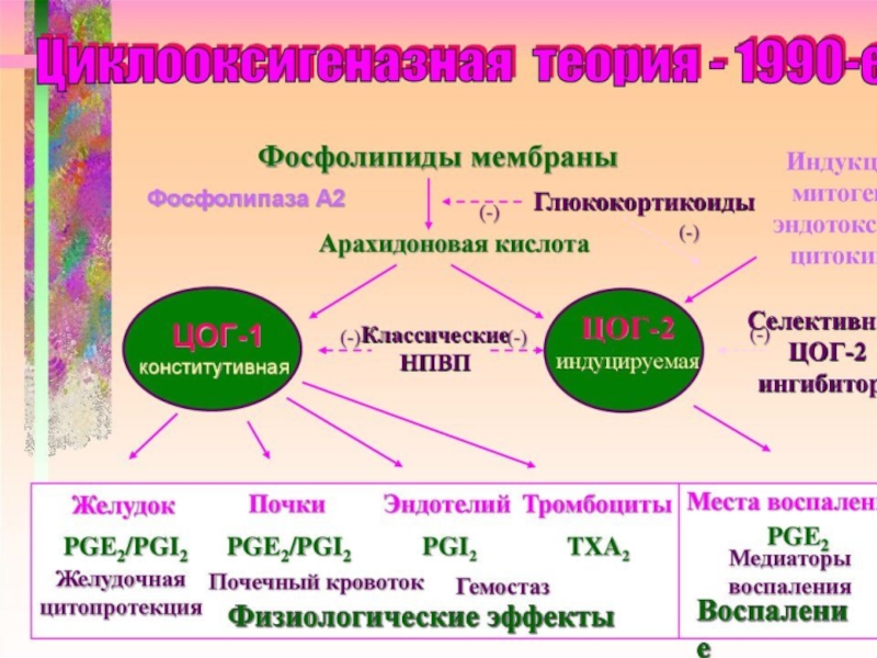 участвует в синтезе простагландинов при воспалении (ЦОГ-2 в нормальных условиях отсутствует, а образуется под действием некоторых тканевых факторов, инициирующих воспалительную реакцию (цитокины и другие).