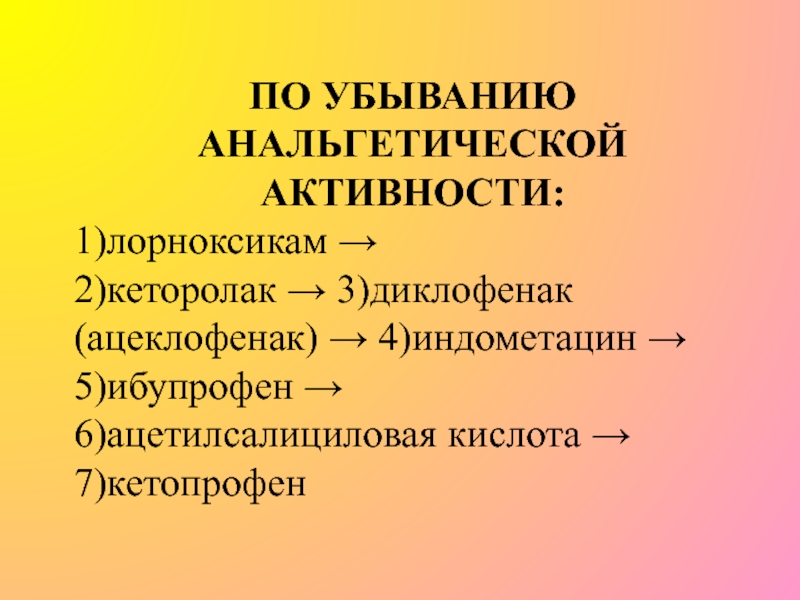 Слайд 19ПО УБЫВАНИЮ АНАЛЬГЕТИЧЕСКОЙ