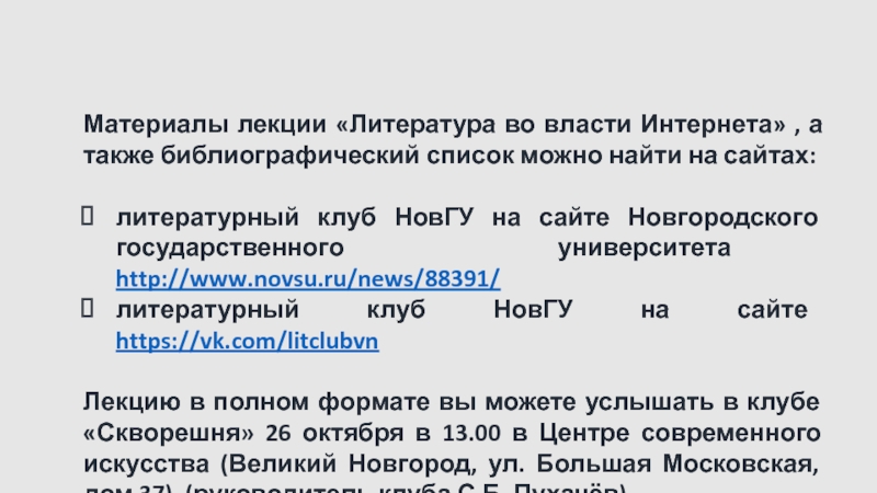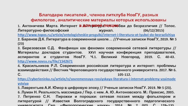 Благодарю писателей , членов литклуба НовГУ, разных филологов , аналитические материалы которых использованы в для моей лекции
