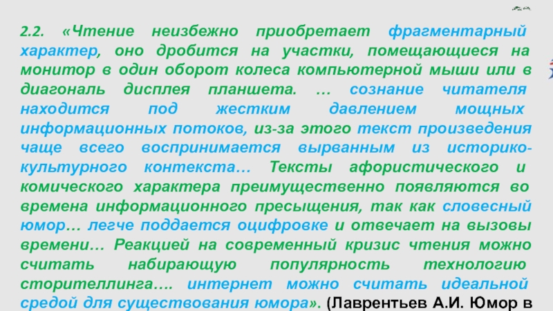 в диагональ дисплея планшета. … сознание читателя находится под жестким давлением мощных информационных потоков, из-за этого текст произведения чаще всего воспринимается вырванным из историко-культурного контекста… Тексты афористического и комического характера преимущественно появляются во времена информационного пресыщения, так как словесный юмор… легче поддается оцифровке и отвечает на вызовы времени… Реакцией на современный кризис чтения можно считать набирающую популярность технологию сторителлинга…. интернет можно считать идеальной средой для существования юмора». (Лаврентьев А.И. Юмор в цифровую эпоху // Ученые записки НовГУ. 2019. № 5 (23))