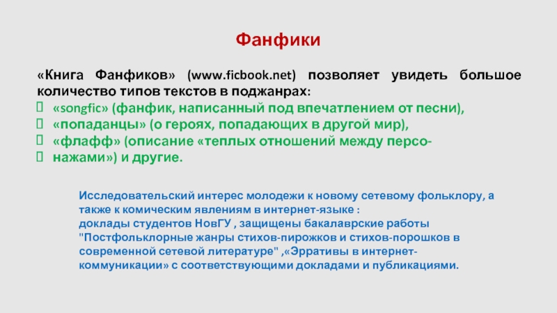 3. Березовская С.Д. Фанфикшн как феномен современной сетевой литературы // Материалы докладов студентов. XXVI научная конференция преподавателей, аспирантов и студентов НовГУ. Ч.1. Великий Новгород, 2019. С. 40-43. http://www.novsu.ru/file/1542671