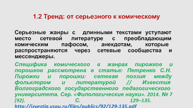 7. Петренко С.Н. Пирожки и порошки: сетевая поэзия между фольклором и литературой // Известия Волгоградского государственного педагогического университета. Сер. «Филологические науки». 2014. № 7 (92). С. 129–135. http://izvestia.vspu.ru/files/publics/92/129-135.pdf