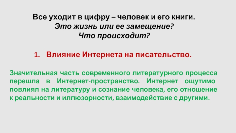 часть современного литературного процесса перешла в Интернет-пространство. Интернет ощутимо повлиял на литературу и сознание человека, его отношение к реальности и иллюзорности, взаимодействие с другими.