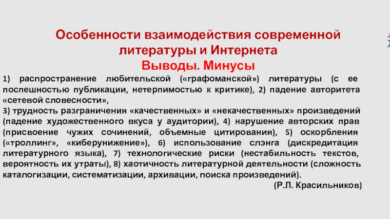 Интернет-коммуникации». Красильников Р.Л. Современная российская литература и интернет: проблемы взаимодействия // Вестник Череповецкого государственного университета. 2017. № 6. С. 105-112. https://cyberleninka.ru/article/n/sovremennaya-rossiyskaya-literatura-i-internet-problemy-vzaimodeystviya