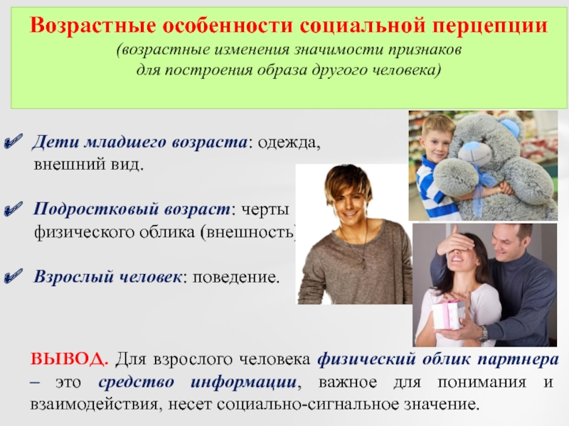 ВЫВОД. Для взрослого человека физический облик партнера – это средство информации, важное для понимания и взаимодействия, несет социально-сигнальное значение.