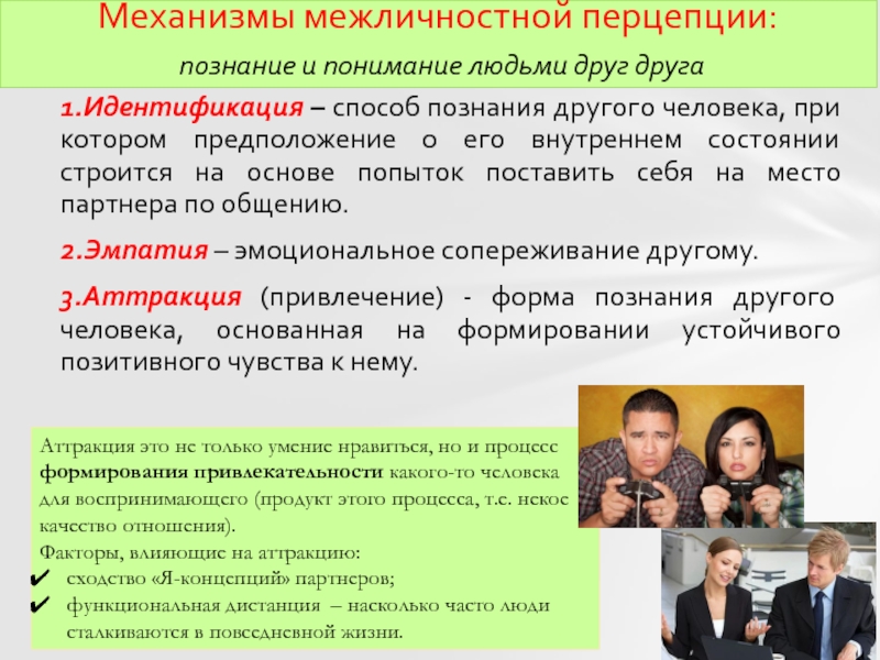 Аттракция это не только умение нравиться, но и процесс формирования привлекательности какого-то человека для воспринимающего (продукт этого процесса, т.е. некое качество отношения).