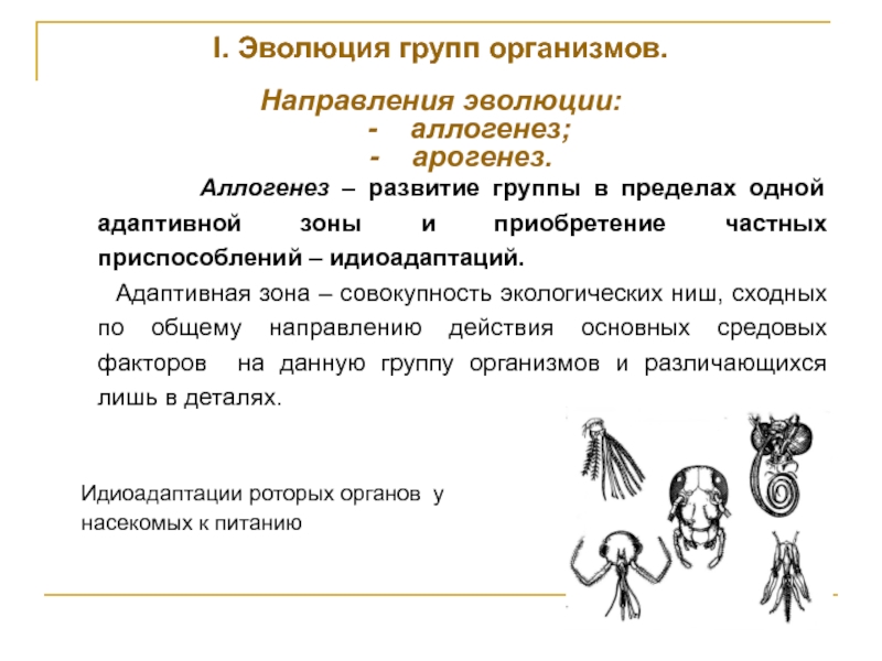 Аллогенез – развитие группы в пределах одной адаптивной зоны и приобретение частных приспособлений – идиоадаптаций.